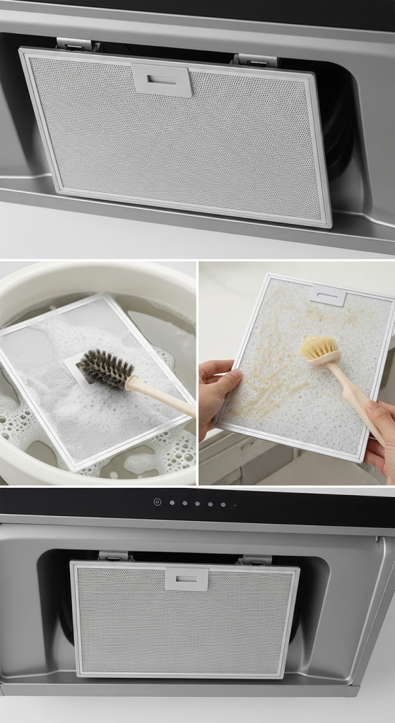 Remove the filter from the range hood. Soak it in warm, soapy water for 10 minutes. Scrub gently with a brush to remove grease and dirt. Rinse thoroughly with clean water and let it dry completely before reinstalling. Regular cleaning maintains efficiency and improves air quality.